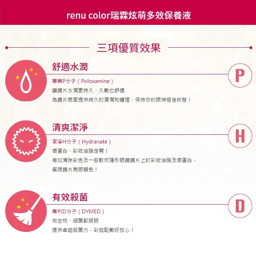 形成保濕柔水膜,並保持鏡片濕潤, 讓清潔後的彩色隱形鏡片配戴舒適,盡情炫耀睛艷色彩。